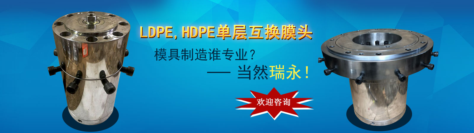 瑞安市瑞永模具有限公司是一家科研、制造、銷售、服務為一體的綜合性企業。專業生產各種規(guī)格的吹膜機膜頭、吹膜機三通、吹膜機風環(huán)、吹膜機旋轉器、吹膜機配件等相關配件的生產廠家;專注吹膜機模具也有15年歷史。